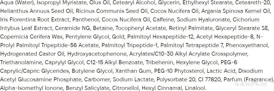 | Активные ингредиенты | гиалуроновая кислота, кофеин, ретинол, пептиды, золото |
