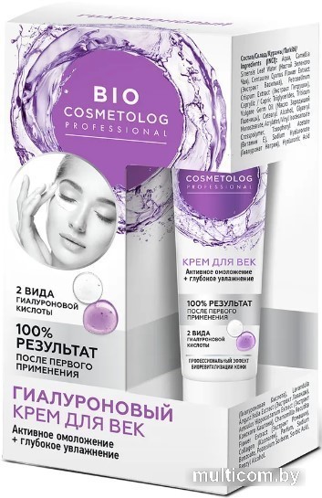 | Информация | Крем для век гиалуроновый с эффектом биоревитализации мгновенно заполняет мимические морщинки, омолаживает нежную кожу век, дарит свежий и отдохнувший взгляд. Активная формула крема с 2 видами гиалуроновой кислоты и коллагеном глубоко увлажняет, укрепляет, разглаживает и подтягивает кожу вокруг глаз. Настой зеленого чая, экстракты василька и петрушки быстро устраняют отеки и темные круги, масло зародышей пшеницы глубоко питает и регенерирует, экстракт ромашки снимает напряжение, витамин Е запускает процессы самоомоложения кожи. Ежедневное применение крема полностью заменяет профессиональную процедуру биоревитализации кожи. |