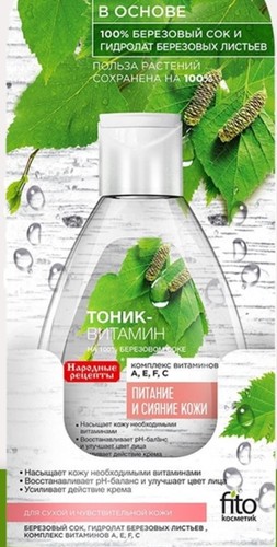 | Информация | Тоник-витамин «Народные Рецепты» на 100% березовом соке и гидролате березовых листьев активно питает и увлажняет кожу, насыщает ее необходимыми витаминами А, Е, F, C. Тоник восстанавливает и смягчает кожу после умывания, подготавливает кожу к дальнейшему уходу и усиливает проникающую способность крема. Гидролат березовых листьев придает коже свежесть и гладкость, наполняя ее сиянием. Березовый сок является природным антиоксидантом, который защищает кожу и ухаживает за ней после применения декоративной косметики, восстанавливает естественный защитный слой. Тоник-витамин — это народный рецепт здоровой, чистой и красивой кожи! |