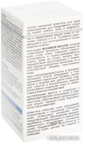 | Информация | Легкий нежирный крем-гель для лица предназначен для ежедневного ухода за кожей любого типа и возраста. Обеспечивает как полноценный уход, так и эффективную защиту кожи от УФ-лучей спектра А и В. Особенно рекомендуется для использования в сухом, жарком климате. Благодаря фолиевой кислоте, которая стимулирует процессы обновления во всех слоях кожи, повышает стресс-устойчивость и стресс-выживаемость клеток, крем активно противодействует фотостарению и появлению ранних возрастных признаков. Гиалуроновая кислота, бетаин, термальная вода — мощный увлажняющий комплекс, который моментально насыщает влагой эпидермис и поддерживает идеальный уровень увлажнения в течение дня, делая кожу гладкой, упругой и восхитительно нежной. Растительные масла в сочетании с фитокомплексом успокаивают и смягчают кожу, обеспечивают антиоксидантную защиту, придают коже бархатистость и красивый цвет. |