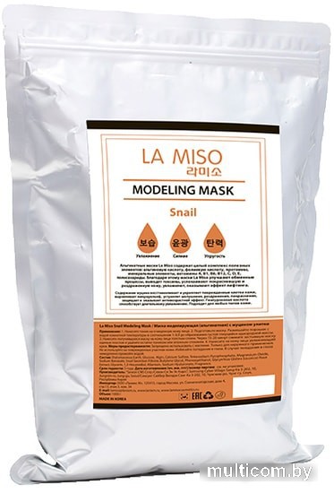| Информация | Альгинатная моделирующая маска для лица с муцином улитки La Miso Modeling Mask Snail подходит для любых типов кожи. Муцин улитки восстанавливает и укрепляет поврежденные клетки кожи, выравнивает микрорельеф, устраняет шелушения, раздражения, покраснения, защищает и оказывает антивозрастной эффект. Гиалуроновая кислота способствует длительному увлажнению. |