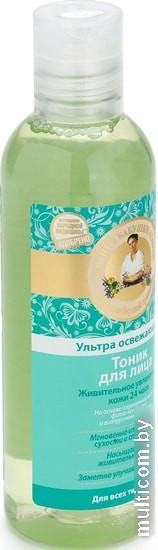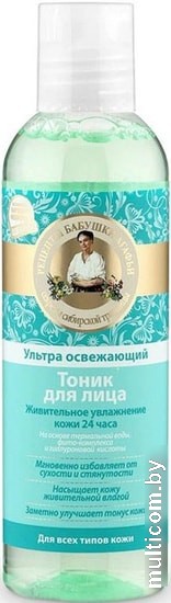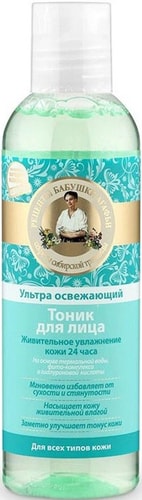 | Информация | Ультра освежающий тоник создан по рецепту сибирской травницы Агафьи, глубоко очищает, мгновенно увлажняет и заряжает кожу энергией. Мощный фито-комплекс на основе экстрактов курильского чая, сверции байкальской и белой сибирской лилии сужает поры и восстанавливает свежий цвет лица. Термальная вода, обогащенная минералами, освобождает кожу от токсинов и дарит длительное ощущение чистоты и комфорта. Благодаря своему сильному увлажняющему действию гиалуроновая кислота делает кожу гладкой и нежной. |