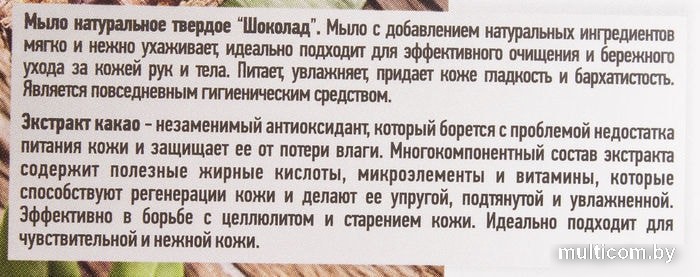 | Информация | Мыло твердое натуральное "Шоколад", 85 г. Ручная работа. Экстракт какао - незаменимый антиоксидант, который борется с проблемой старения кожи и защищает кожу от потери влаги. В составе экстракта много полезных микроэлементов и витаминов, которые способствуют регенерации кожи и делают кожу упругой, подтянутой и увлажненной. Косметика на основе экстракта применяется в качестве профилактики целлюлита. Идеально подходит для чувствительной и нежной кожи. |