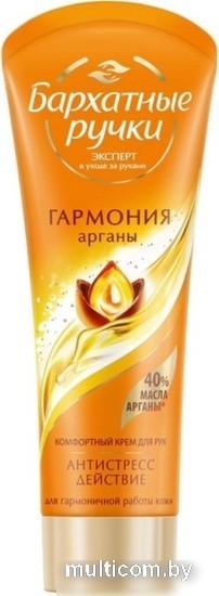 | Информация | Крем для рук Бархатные Ручки «Королевская аргана» увлажняет кожу в течение 48 часов! Масло арганы — одно из самых ценных и эффективных масел в мире — его называют «жидким золотом». Входящие в состав крема незаменимые омега-кислоты превосходно питают кожу. Благодаря высокой концентрации антиоксидантов в масле, крем продлевает молодость кожи рук. |