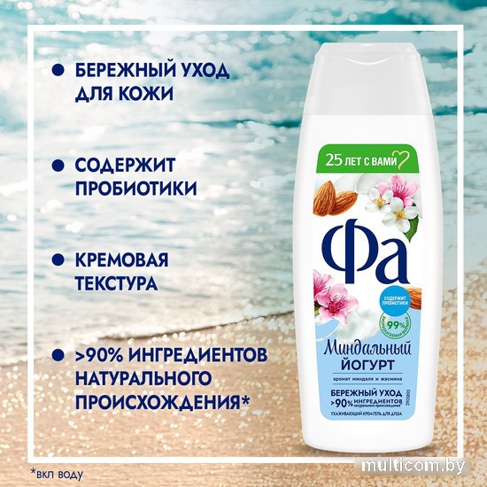 | Информация | ? Почувствуй легкую свежесть и погрузись в мир новых впечатлений с гелем для душа Fa Миндальный йогурт. ? Его вдохновляющий аромат миндаля и жасмина подарит тебе незабываемые ощущения. ?? Содержит более 90% ингредиентов натурального происхождения, что делает его особенно бережным к коже. ? Кроме того, этот гель для душа содержит пребиотики, обеспечивая дополнительный уход за кожей. ? Погрузись в мир нежности и ухаживающего действия с крем-гелем для душа Fa Миндальный йогурт объемом 250 мл. |