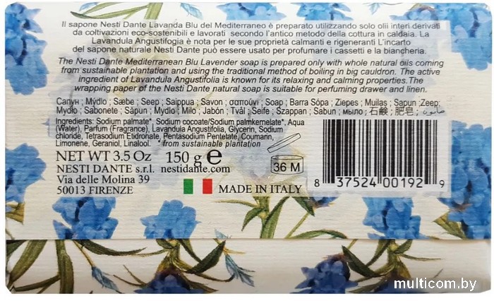| Информация | ? Мыло Lavanda Blu del Mediterraneo (Лаванда голубое Средиземноморье) - это идеальное средство для гармонизации тела и души. ? Погрузитесь в атмосферу безмятежного солнечного полудня с мылом Lavanda Blu del Mediterraneo (Лаванда голубое Средиземноморье). ? Насладитесь ароматом лаванды и пряного разнотравья с мылом Lavanda Blu del Mediterraneo (Лаванда голубое Средиземноморье). ? ?? Весит 150г. ? Мыло Lavanda Blu del Mediterraneo (Лаванда голубое Средиземноморье) обладает регенерирующим, очищающим и увлажняющим действием благодаря лаванде и другим натуральным ингредиентам. |