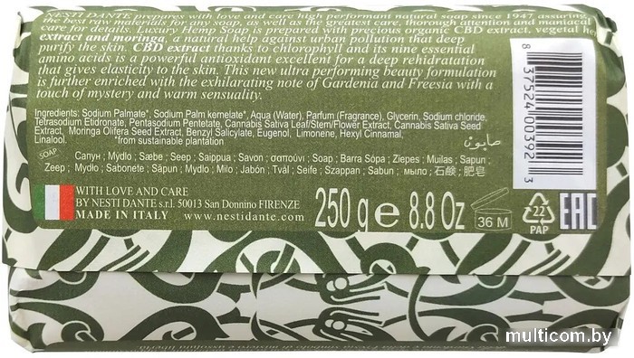 | Информация | ? Мыло твердое Nesti Dante Luxury Hemp Soap (250г) содержит натуральные ингредиенты: масло пальмовое, экстракт семян конопли, экстракт семян моринги и другие. ? Это мыло обладает приятным ароматом и хорошо пенится, обеспечивая бережный уход за кожей. ? Благодаря содержанию экстракта конопли, мыло увлажняет и питает кожу, делая ее мягкой и ухоженной. ? ?? Продукт не содержит парабенов и искусственных красителей, что делает его идеальным для чувствительной кожи. |
