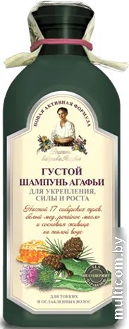 | Информация | Густой шампунь Агафьи для укрепления, силы и роста волос создан на настое сосновой живицы на талой воде, сбора 17 сибирских трав, с добавлением белого меда и репейного масла. Содержание в шампуне талой воды обеспечивает щадящую основу для мытья, настой трав, белый мед, репейное масло служат увлажнением и питанием слабому волосу, укрепляют и стимулируют его рост. Сочетание активных питательных компонентов дарит вашим волосам комплексную заботу: укрепление, силу и рост. |