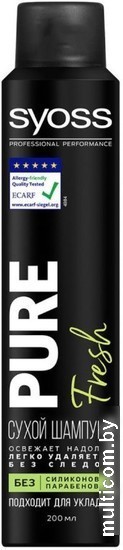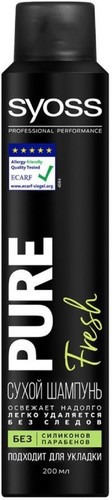 | Информация | Сухой шампунь SYOSS Pure Fresh надолго оставляет волосы свежими. Не оставляет следов на волосах после расчесывания. Не содержит силиконов и парабенов. Веганская формула сертифицирована Европейским центром исследований аллергии |