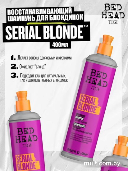| Информация | Шампунь Tigi Bed Head Serial Blonde Восстанавливающий для блондинок (400 мл) - идеальное решение для супер блондинок, которые ищут супер уход за своими волосами. В его составе присутствуют кератин и аминокислоты, которые несомненно помогут восстановить жизненную силу волос после окрашивания. Благодаря своей нежной формуле, шампунь бережно очищает волосы, не пересушивая их. А еще, он способен усилить яркость и блеск вашей прически, делая ее еще более привлекательной. |