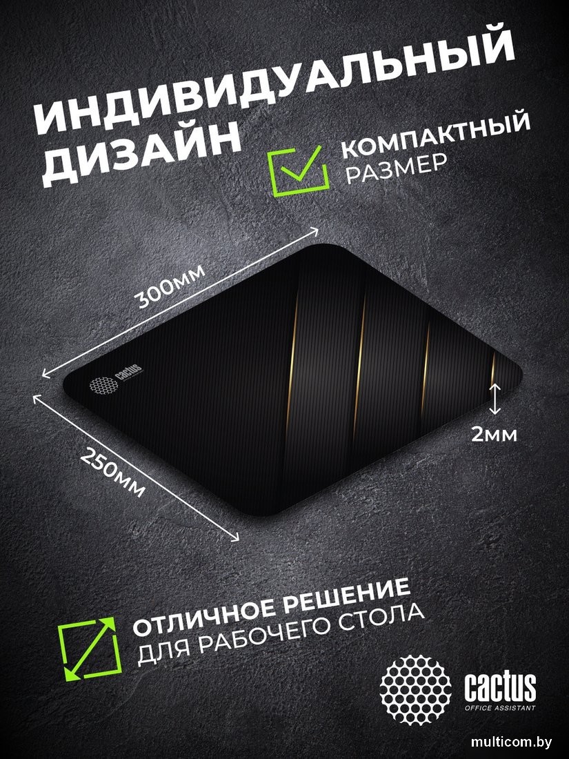 | Информация | Коврик для мыши Cactus идеально подойдёт фанатам логических головоломок, квестов и стратегий. Он также будет полезен и пользователям офисных программ и графических редакторов, помогая более полно взаимодействовать с компьютерной мышью и точно позиционировать курсор. Лицевая сторона коврика обработана специальной тканью, которая очень комфортна на ощупь и гарантирует плавность и высокую точность передвижений курсора. Она обладает высокой прочностью и износостойкостью. Материал легко выдерживает постоянные движения мышью, поэтому он надолго сохранит привлекательный внешний вид. Нижняя часть коврика, благодаря прорезиненному основанию, обеспечивает надежное сцепление с поверхностью стола. Поэтому, даже если пользователь будет совершать интенсивные движения мышкой, это не приведет к случайному сдвиганию коврика. |