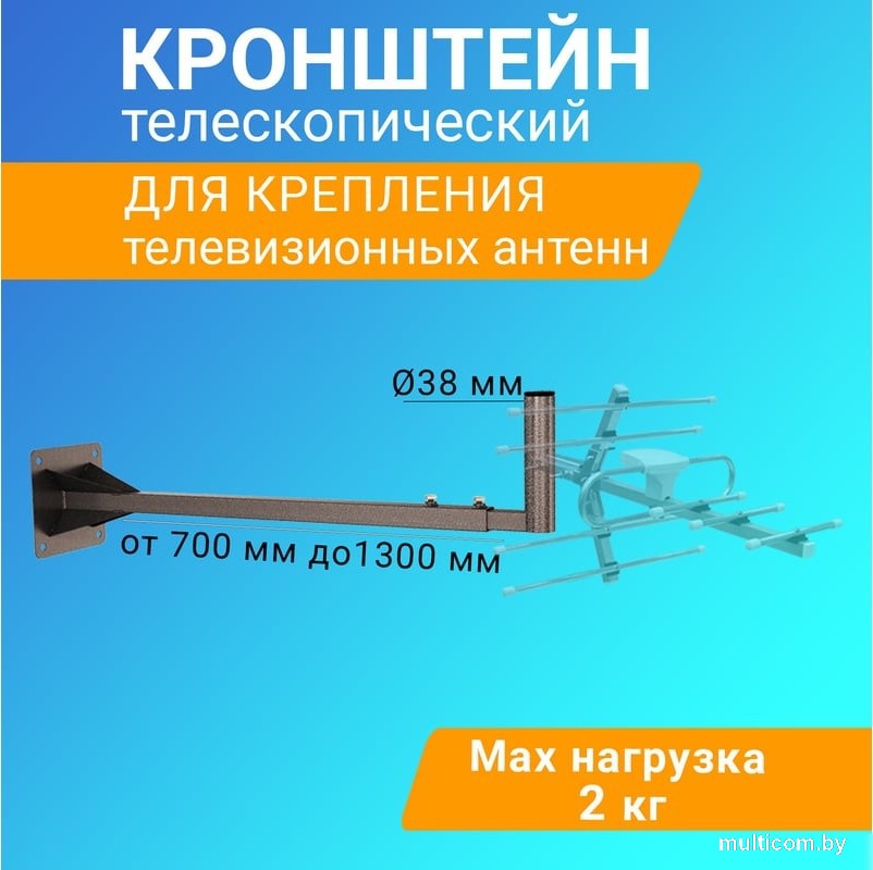 | Информация | Кронштейн эфирный телескопический используется для крепления телевизионных антенн на балконы, оконные рамы, стены строений, фасады зданий и сооружений. Крепление антенны на кронштейн улучшает качество принимаемого сигнала и предотвращает появление помех, которые образуются от электронных устройств, стен и крыш. Кронштейн изготовлен из стали и окрашен специальной порошковой краской, что обеспечивает защиту от внешних факторов и долгий срок службы в неблагоприятных условиях окружающей среды. Вылет от стены регулируется от 70 до 130 см с помощью двух профилей (первый профиль — 30?30 мм, второй — 25?25 мм). Носик длиной 170 мм имеет форму трубы (диаметр 38 мм, толщина стенки 1.5 мм). Размер площадки для крепления к стене составляет 170?170 мм, толщина — 2 мм. Предусмотрено 4 отверстия для крепления диаметром 11 мм. |