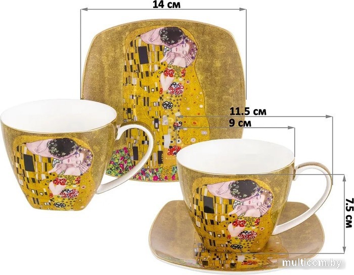 | Информация | ? Набор "Поцелуй" идеально подойдет в качестве роскошного подарка для родных, близких или коллег, так как поставляется в подарочной упаковке. ? Кружки и тарелки не предназначены для использования в микроволновой печи. ?? Посуда для питья имеет длину/диаметр 9 см, ширину 11.5 см и высоту 7.5 см. ?? Посуда для сервировки имеет длину/диаметр 14 см и ширину 14 см. |