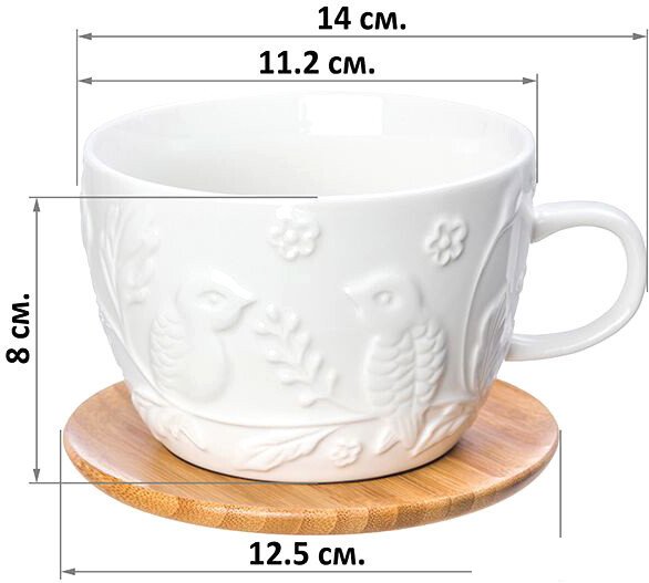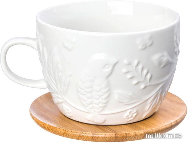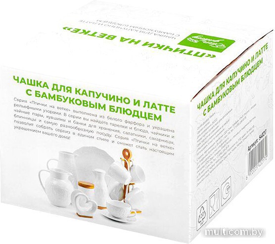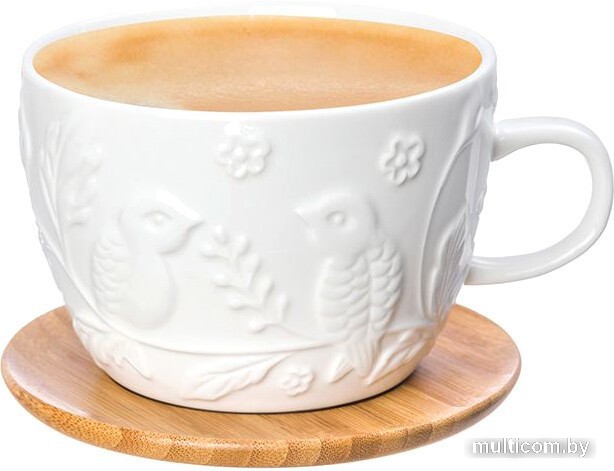 | Информация | Чашка для капучино и латте из серии «Птички на ветке»» объемом 500 мл с деревянной крышкой-подставкой выполнена из высококачественного фарфора и натурального бамбука. Теплое цветовое решение, изящный рельефный рисунок на фарфоре и удобство использования делают эту чашку желанным подарком любой хозяйке. У чашки большой объем, что позволил приготовить нужное количество напитка. |
