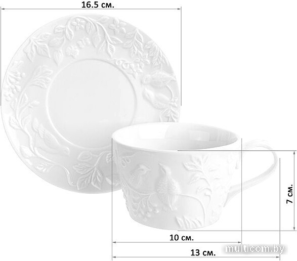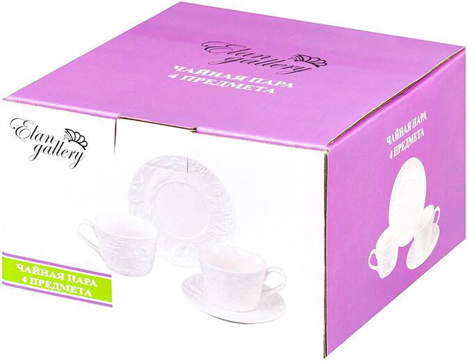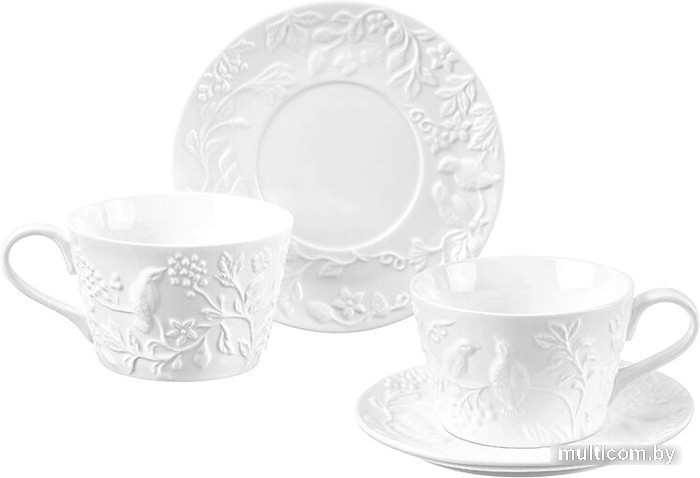 | Информация | Набор из 2-х чайных пар поможет провести множество приятных чаепитий. Чашки в наборе имеют объем по 360 мл, диаметр каждого блюдечка 16,5 см. Чайные пары выполнены из высококачественного фарфора и украшены рельефными изображениями птичек с растительными орнаментами. Подходят для чая, кофе, сока, лимонадов и других напитков. Фарфор не впитывает цвет напитков и не деформируется от влаги. Такие чайные пары долгое время будут выглядеть, как новые! Подходят для использования в микроволновой печи и посудомоечной машине. В наборе 4 предмета: 2 чашки и 2 блюдца. |