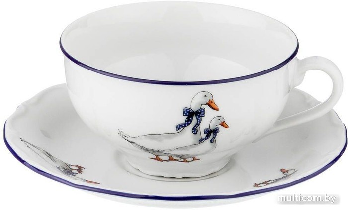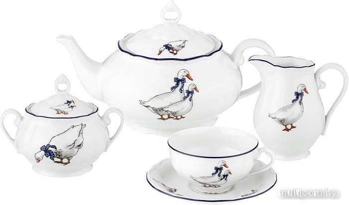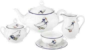 | Информация | Посуда уникальна по-своему составу — более прочная, износостойкая, устойчивая к сколам. «Гуси» — один из самых узнаваемых и популярных декоров на чешском фарфоре. Эти милые и очаровательные птицы в элегантных синих галстуках в белый горох знакомы всем. В Европе они издавна считаются символом достатка, оберегом семейного очага. Изделия можно спокойно ставить в микроволновку и мыть в посудомоечной машине. Специальные технологии не дают стираться верхнему защитному покрытию, что надолго сохраняет яркость и целостность рисунка. В наборе чайник, чашка (6 шт.), блюдце (6 шт.), сахарница, молочник |