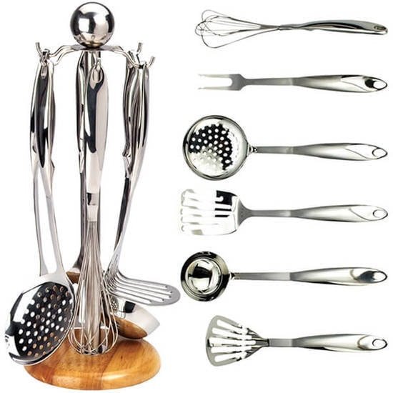 Состав набора | венчик, вилка, картофелемялка, ложка, подставка, половник, шумовка |