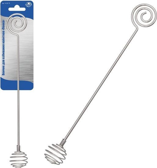 | Информация | Применяется для взбивания напитков, коктейлей, кофейной пенки, яиц, а также может применяться в качестве ложки для меда. Изготовлено из коррозионностойкой (нержавеющей) стали. Общая длина 20 см. |