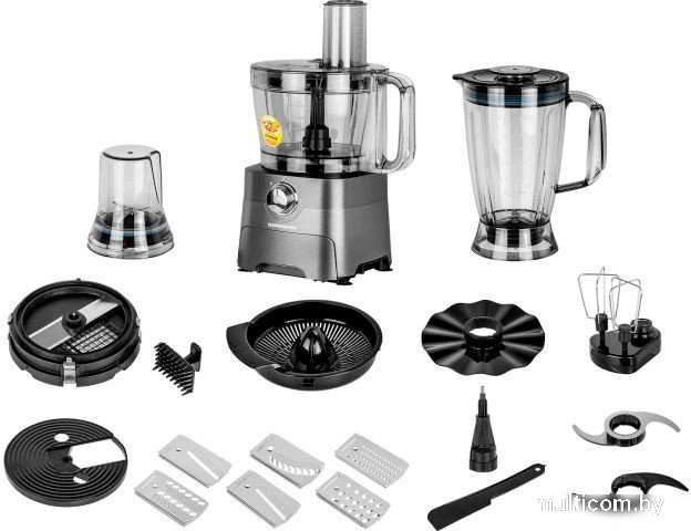 | Функции | блендер, цитрус-пресс, взбивание, смешивание, замешивание дрожжевого теста, измельчитель, рубка, терка, шинковка, ломтерезка, нарезание кубиками, драники, помол круп, кофе |