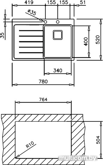 | Комплектация | квадратный корзинчатый слив на 3 1/2” с клапаном-автоматом, декоративная квадратная пластина для слива, сливная арматура, крепежи, алюминиевый профиль прикреплен к периметру мойки |