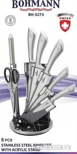 | Комплектация | Нож шеф-повара: - лезвие 20 смНож для хлеба: - лезвие 20 смНож универсальный: - лезвие 12.5 см Нож для овощей: - лезвие 8.5 смКухонный топорик: - лезвие 16.5 см НожницыТочилка для ножейАкриловая подставка |