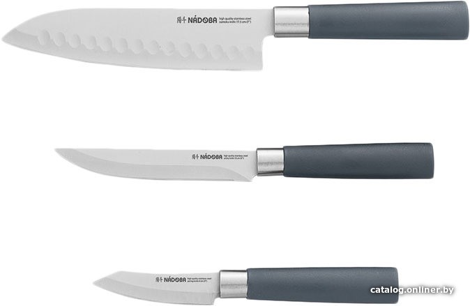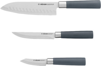 | Комплектация | - Нож для овощей, 8 см; - Нож универсальный, 13 см; - Нож Сантоку с углублениями 17,5 см |