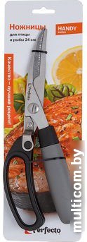 | Информация | Применение ножниц для рыбы и птицы значительно упрощает процесс разделки рыбы, особенно при скользкой поверхности. Также легко разрезается любая птица на части, так как они без затруднений делят костно-хрящевые сочленения. |
