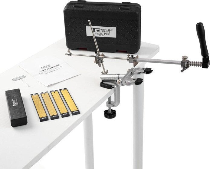 | Комплектация | Профессиональная точилка для ножей RX-009 Набор алмазных заточных камней с титановым покрытием Подарочная коробка для точильных камней Набор инструментов (1 * Шестигранный ключ, 2 * Защитный чехол для лезвия) Руководство по продукту Жесткий футляр для переноски |