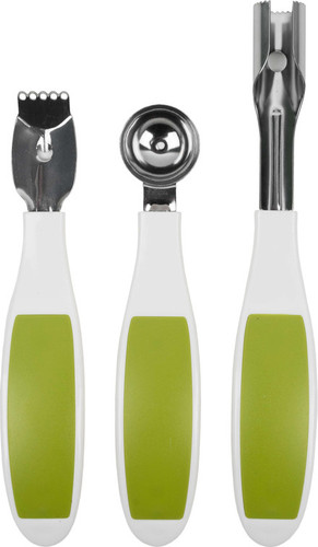 | Информация | Набор для изготовления украшений из фруктов, зеленый, в набор входит: нож для удаления сердцевины из плодов 21 см, ложка для мякоти дыни 17 см, нож для снятия цедры 19 см |