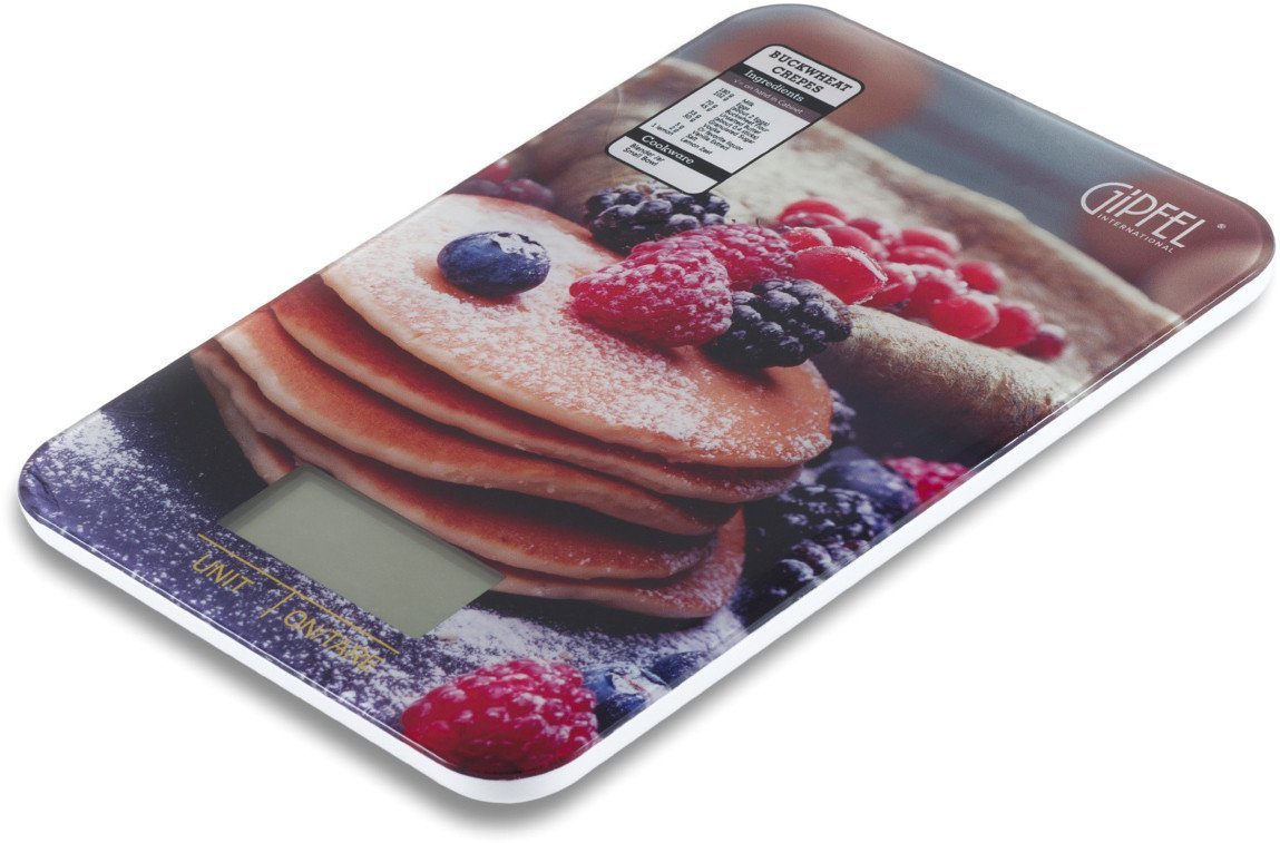 Информация | Весы кухонные электронные Gipfel RIO 5854. Размер весов 23х15х1,3 см. В комплекте идет брошюра с рецептами десертов. Сделаны из акрила с деталями из пластика. Весы работают от 2-х батареек типа CR2032 (не входят в комплект). Размер ЖК-экрана: 55х23 мм. |