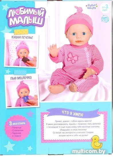 | Информация | Интерактивный пупс «Малыш» умеет говорить и при этом шевелить губами, моргать глазками. А ещё он поёт песенку. Кукла предложит ребёнку сыграть в ладушки, попросит накормить печеньем и дать попить молочко. Для игры с пупсом в комплекте есть дополнительные аксессуары:печенье, стаканчик, тарелочка с ложкой. Пупс разговаривает, кушает с ложечки (причмокивает), пьёт (реагирует на кружечку), кушает печенье (звук откусывания, когда подносишь печенье). |