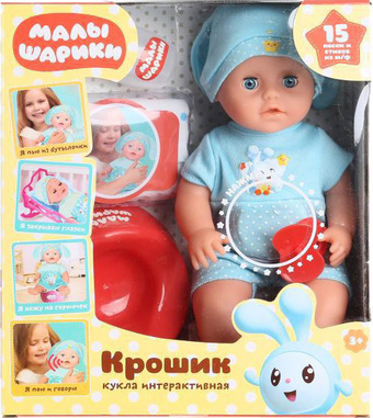 | Информация | Интерактивная кукла «Малышарики. Крошик» ТМ «Карапуз» — лучший подарок для девочки: - рассказывает стихи про хорошие манеры и окружающим мир; - песни из м/ф «Малышарики»: «Вода», «Красный», «Одежда», «Я болею» и другие; - пьет из бутылочки; - ходит на горшок; - закрывает глазки. Очаровательная кукла в костюме Крошика из любимого мультфильма непременно понравится малышу. Играть с такой игрушкой интересно: кукла поет и говорит. |