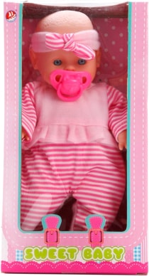 | Информация | У крохи мягкое тельце, ручки, ножки и голова твёрдые. Малыш одет в нежно-розовый детский комбинезон, застёгивающийся сзади на липучку. На голове у него милая текстильная повязка с бантом. В комплекте прилагается соска-пустышка. |