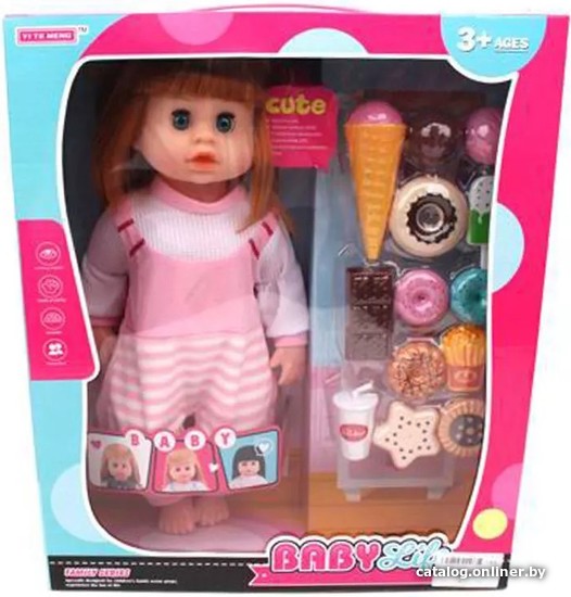 | Информация | Вместе с игровым набором «Мой малыш» девочка сможет попробовать себя в новой роли – мамы, развивая в процессе игры коммуникативные навыки, воображение и фантазию. В комплекте прилагается очаровательная кукла, которая обладает следующими функциями: она умеет пить и писать. У крохи твёрдое тельце, подвижные ручки, ножки и голова, а также подвижные веки с объёмными ресничками. При нажатии на животик кукла воспроизводит слова («папа», мама»), звуки (плачет, смеется, зевает, гулит, кашляет, чихает). В комплекте прилагаются аксессуары: стаканчик с напитком, плитка шоколада, мороженое, картофель-фри, пончики – всего 12 предметов. Звуковое устройство работает от 3-х батареек типа AG13 (элементы питания входят в комплект). Перед игрой необходимо удалить пластиковую заглушку, размещенную на крышке блока с батарейками. Высота куклы составляет 40 см. Изделие изготовлено из полимерных материалов с элементами из текстильных материалов. Рекомендованный возраст: 3 года + |