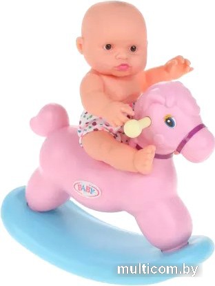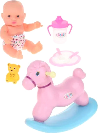 | Комплектация | Пупс, бутылочка, тарелка, ложка, вилка, мишка-пищалка и лошадка-качалка. |