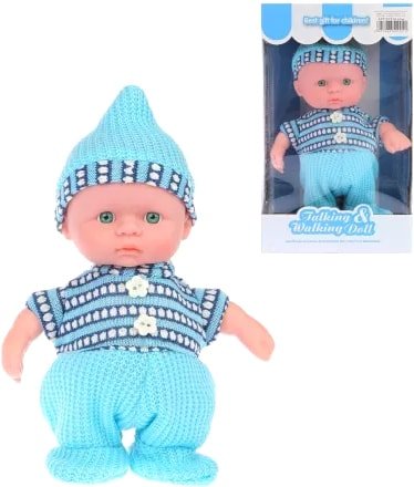 | Информация | Трогательный малыш-пупс умеет ходить и повторять услышанные слова! У крохи твёрдое тельце и вставные глазки из пластика, голова выполнена из ПВХ. Малыш одет в синий вязаный костюмчик и шапочку. |