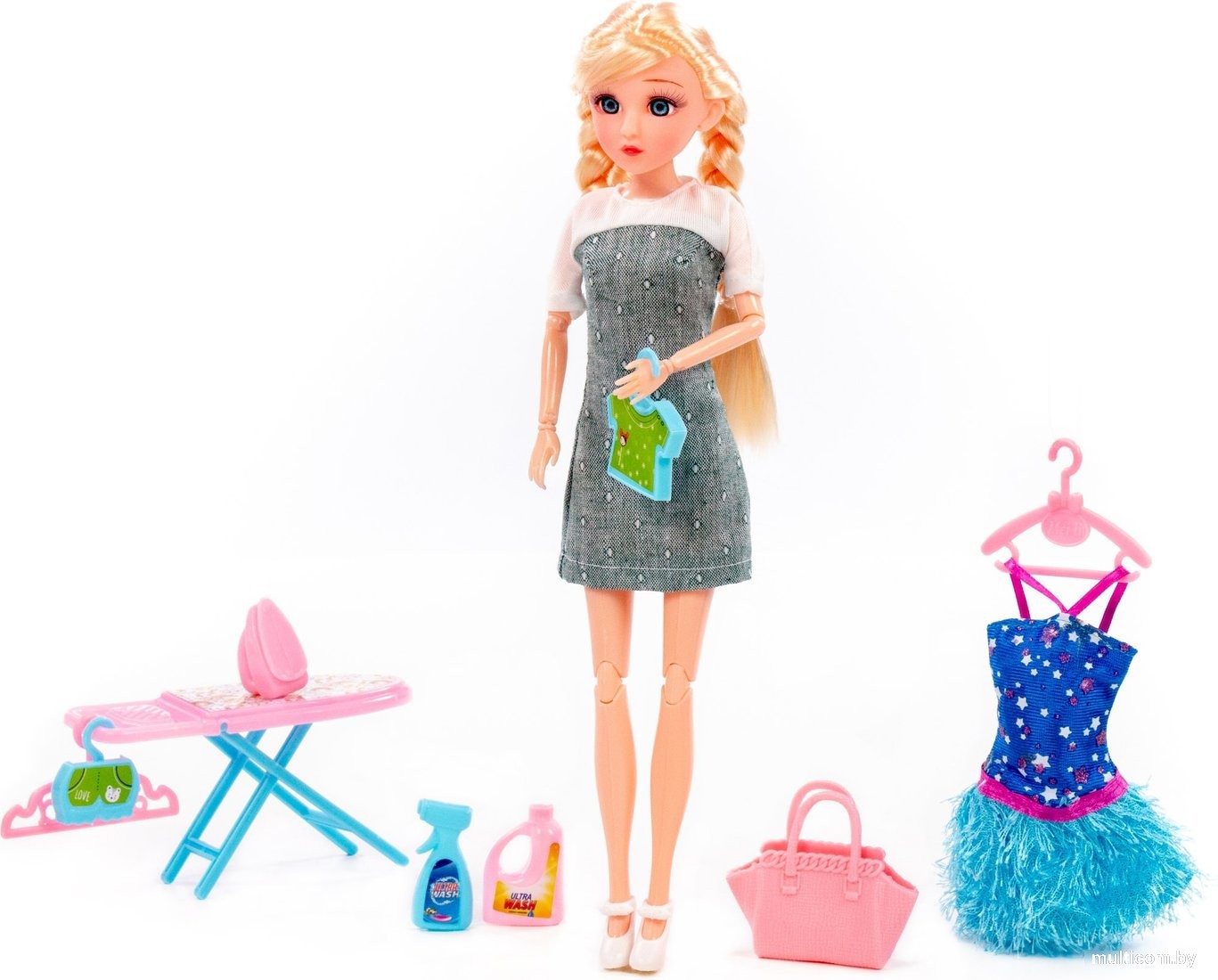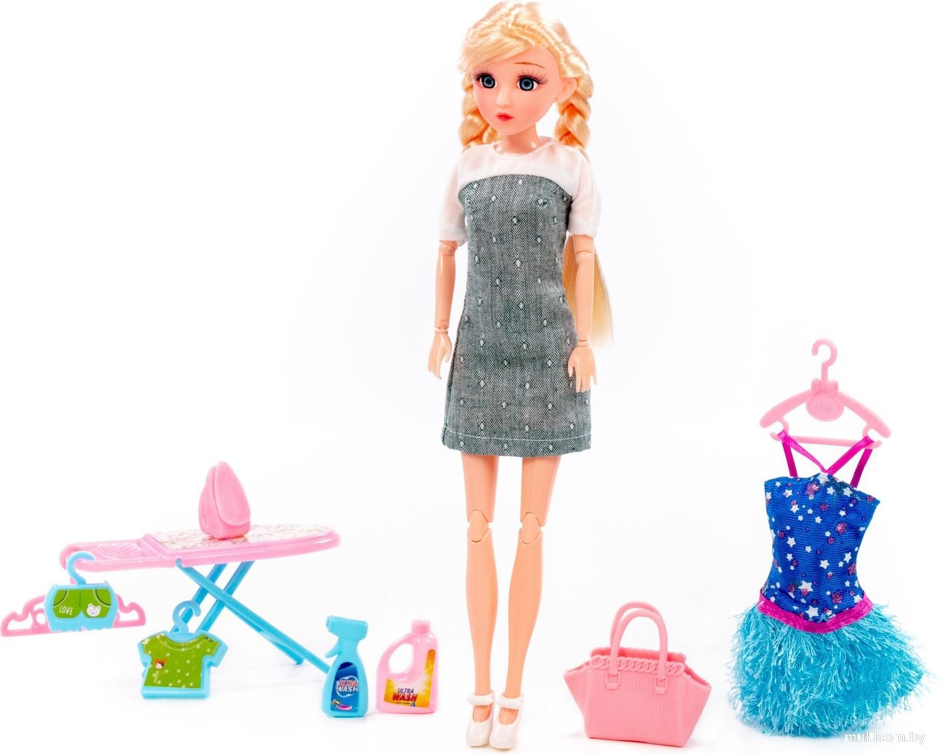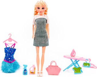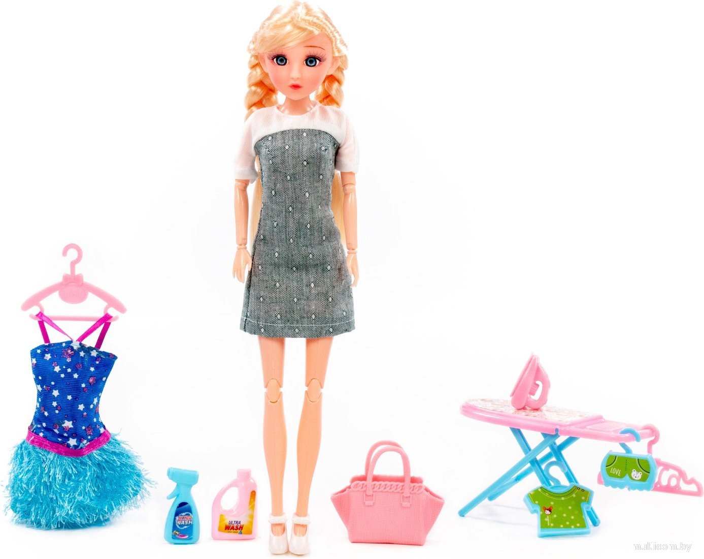 | Комплектация | кукла «Ксюша», игрушечная сумочка, утюг, гладильная доска, имитация одежды на вешалках, игрушечные моющие средства для уборки и стирки, вешалки для одежды, нарядное блестящее платье |