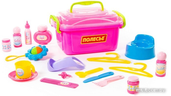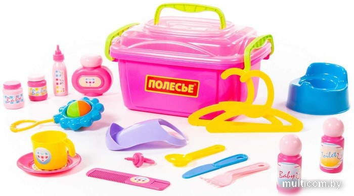 | Комплектация | ночной горшок, соска, бутылочка для кормления, погремушка, флаконы для присыпки, баночки, вешалки, расческа, слюнявчик, блюдце, чашка, ложка, нож, вилка |