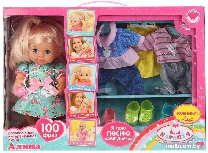 | Информация | Интерактивная кукла Алина станет замечательным подарком для вашей принцессы:- поёт песню «АБВГДейка»- знает 3 стихотворения, 2 скороговорки, 2 загадки- произносит 100 фраз- закрывает глазки- пьёт из бутылки- ходит на горшокАлина – настоящая модница, она одета в очаровательное сатиновое платье розового цвета с принтом «горох». У платья кружевные рукава-оборки и большой бант на поясе. Одежда легко надевается и снимается. У куколки гладкие блестящие волосы, которые легко расчесывать. Алину можно переодеть в один из стильных комплектов из её гардероба: комбинезон с сиреневым верхом, украшенным милым принтом, с розовой баской и яркими штанишками; ярко-розовое худи с принтом-единорогом, дополненное серыми юбочкой и шапочкой; розовый комбинезон с яркой отделкой и чудесным принтом-мышонком. |