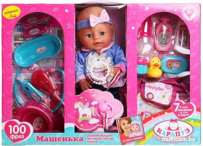 | Информация | - поёт 7 песен на стихи А. Барто: «Лошадка», «Бычок», «Зайка», «Мячик», «Козлёнок», «Кораблик», «Мишка»- произносит разнообразные фразы: «Измерь мне температуру», «Мама, вылечи меня», «Мама, я заболела», «Послушай, как бьётся моё сердце», «Ты - лучшая мама на свете» и др. |