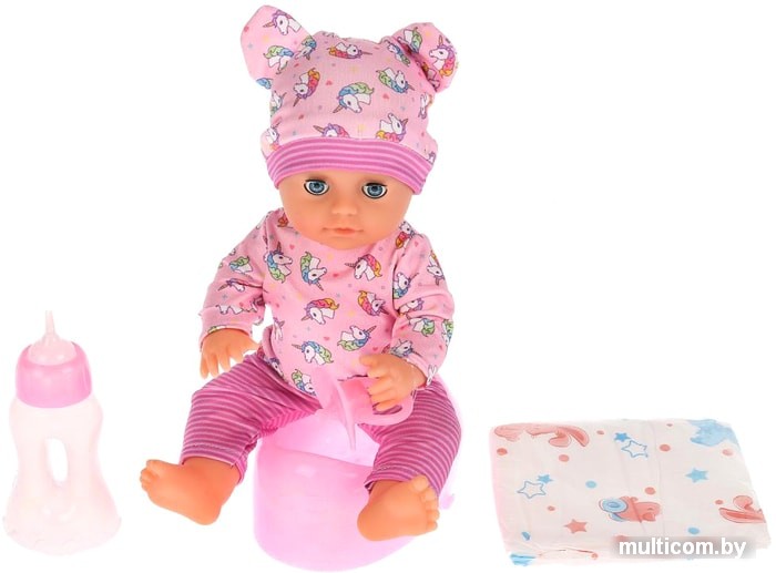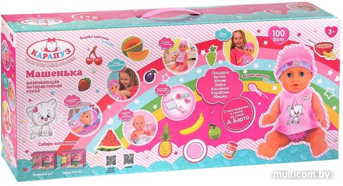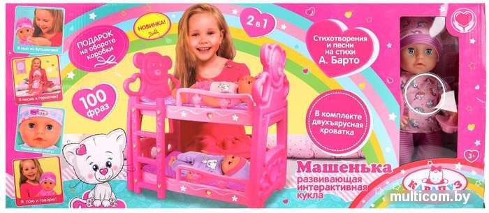 | Информация | Игрушку, одетую в яркий костюмчик с единорогами и забавную шапочку с ушками, можно напоить водичкой из бутылочки. Пупс после этого писает в горшок, а еще Машенька никогда не расстается с любимой соской, которая легко вставляется в ее ротик.Игрушка знает 100 фраз, поёт малышкам песенки и рассказывает стихи Агнии Барто: «Лошадка», «Мячик», «Бычок» , «Мишка», «Козлёнок», «Кораблик». |