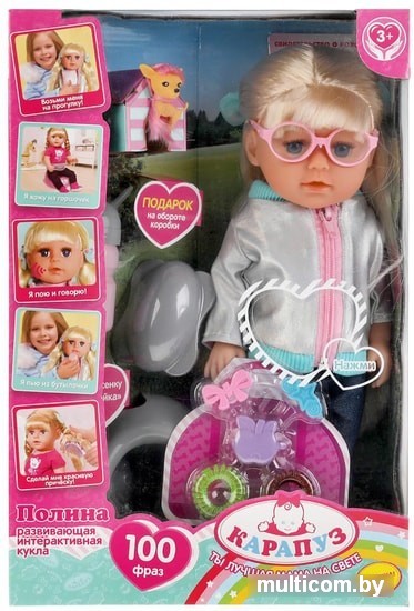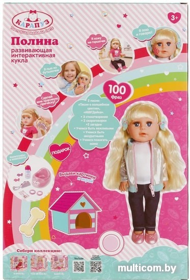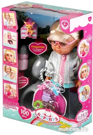 | Информация | Развивающая интерактивная кукла Полина с питомцем станет прекрасным подарком для вашей маленькой принцессы:- поёт 2 песни: «АБВГДейка» и «Песня о волшебном цветке»- рассказывает 3 стихотворения- знает 2 скороговорки- загадывает 2 загадки- говорит 100 фраз- пьёт из бутылочки- ходит на горшок- подарок на обороте коробки- учимся быть вежливыми и аккуратными- учимся помогать мамеМилая кукла с детально проработанным личиком обязательно понравится малышке. Полина одета в серебристую курточку на молнии и джинсы, на ногах - голубенькие туфельки. Образ дополняют стильные очки в розовой оправе. Одежда и обувь легко снимаются и надеваются. У куклы длинные красивые волосы, которые можно расчёсывать и укладывать в разные причёски - для этого в наборе имеется расческа, резиночки и заколки. Кроме того, для более интересной игры в комплекте с куклой идёт милая собачка. |