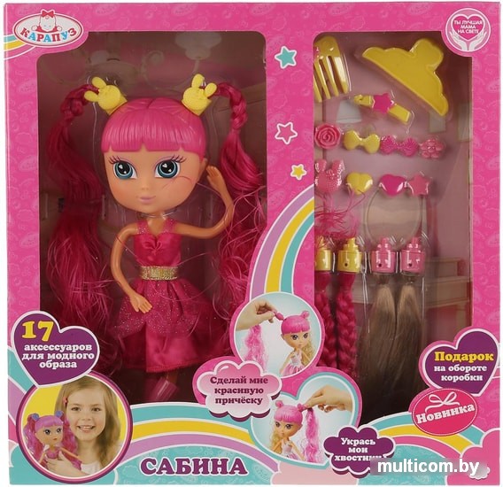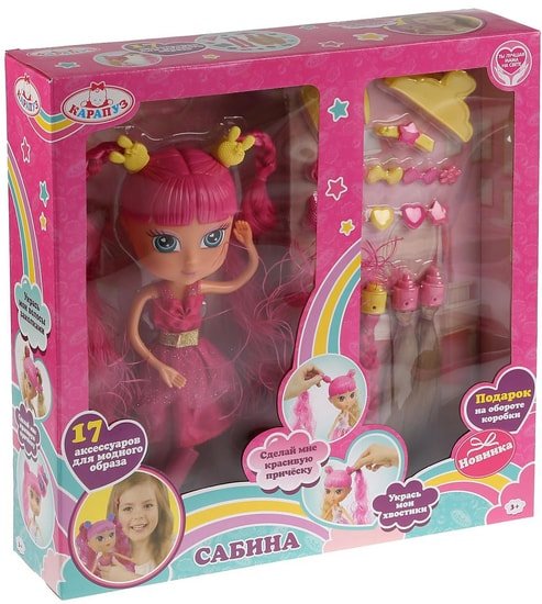 | Информация | На Сабине: модное платье и туфли (легко снять и надеть). Лицо куклы детально проработано. Волосы можно менять, делая разные комбинации. Длинные шелковистые волосы легко расчёсывать и создавать разнообразные причёски.Функции куклы:- волосы меняютсяАксессуары 17 в 1:- 2 набора комбинированных волос- расчёска- заколки- подарок на обороте коробкиИгра с куклой учит ребёнка:- заботиться- быть ответственным и внимательнымРазвивает:- ответственность- чувство стиля- воображение |