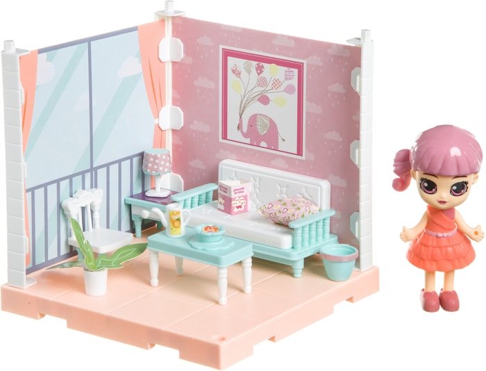 | Комплектация | стул, диван, тумба, декоративные растения, журнальный столик, посуда (чайник, тарелка), ваза (2), подушка, лампа, куколка |