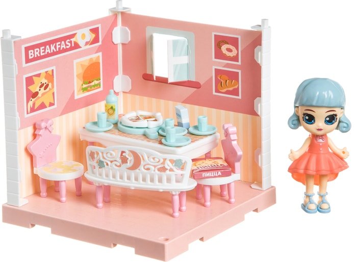 | Комплектация | обеденный стол, стул (2), посуда (тарелки - 4 шт., стаканы - 4 шт., поднос), продукты, скамья, куколка |