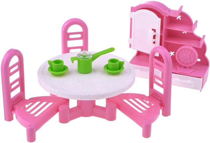 | Комплектация | 3 стула; 4 предмета посуды; сервант с полочками и шкафчиками; часы настольные |