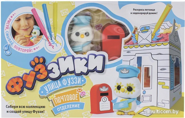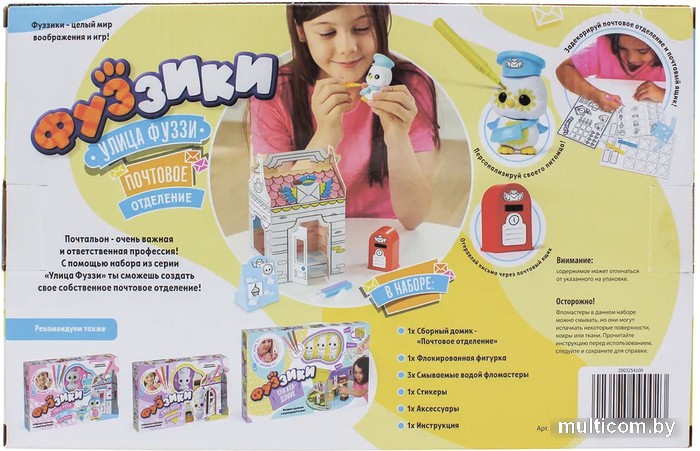 | Информация | Игровой набор состоит из сборного домика Почтового отделения, флокированной фигурки птички, которая является главном почтальоном на улице Фуззи. У питомца есть все, что необходимо для работы: шляпа, сумочка для писем, почтовый ящик, открытки и марки. В наборе вы найдете смывающиеся водой фломастеры, чтобы украсить и персонализировать флокированного малыша, множество аксессуаров и стикеров, каждый из которых можно за декорировать на свой вкус и цвет. Создайте оживленную улицу с наборами Фуззи-стрит! |