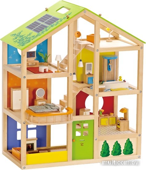 | Информация | В этом ярком домике девочки обнаружат 6 комнат и множество дополнительных игровых аксессуаров, выполненных в виде мебели и элементов интерьера.На первом этаже есть входная дверь, через которую попадаешь в гостиную и кухню с реалистичной бытовой техникой.Поднявшись по лесенке, оказываешься в спальне с удобной кроватью, чуть выше расположена ванная комната с душевой кабиной.Верхний уровень предназначен для отдыха, там есть комната с компьютером и терраса.Дети могут менять назначение комнат, переставляя в них мебель, на крыше изображена имитация солнечных батарей. |