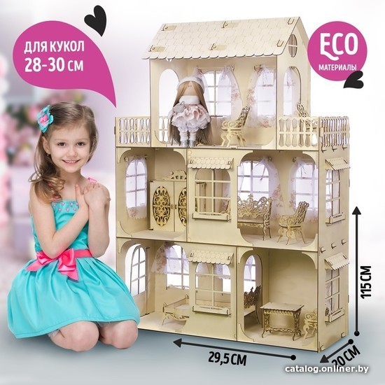 | Информация | Все детали выполнены из долговечного и экологичного материала — дерева. Края тщательно обработаны и безопасны для ребёнка. Поставляется в разобранном виде, при сборке для дополнительной прочности используйте клей. Домик состоит из трёх ярусов, высота каждого из них — 33 см. Размеры домика в собранном виде: 115 ? 82,5 ? 29 см. Подходит для кукол 28–30 см. Домик можно раскрасить и обустроить на свой вкус. Каждое окно оснащено карнизом, а значит, малышка сможет самостоятельно сшить занавески и получить новый навык. |