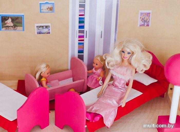 | Комплектация | В комплект текстиля входит 15 предметов: - для кукольных кроватей (по 2 шт.) красные простыни, белые одеяла, белые прямоугольные подушки; - для люльки: белая простыня, розовое одеяльце, розовая подушечка; - для дивана: 4 большие подушки (2 - сиреневые, 2 - белые); - красный коврик в спальню; - зеленый коврик в гостиную. |